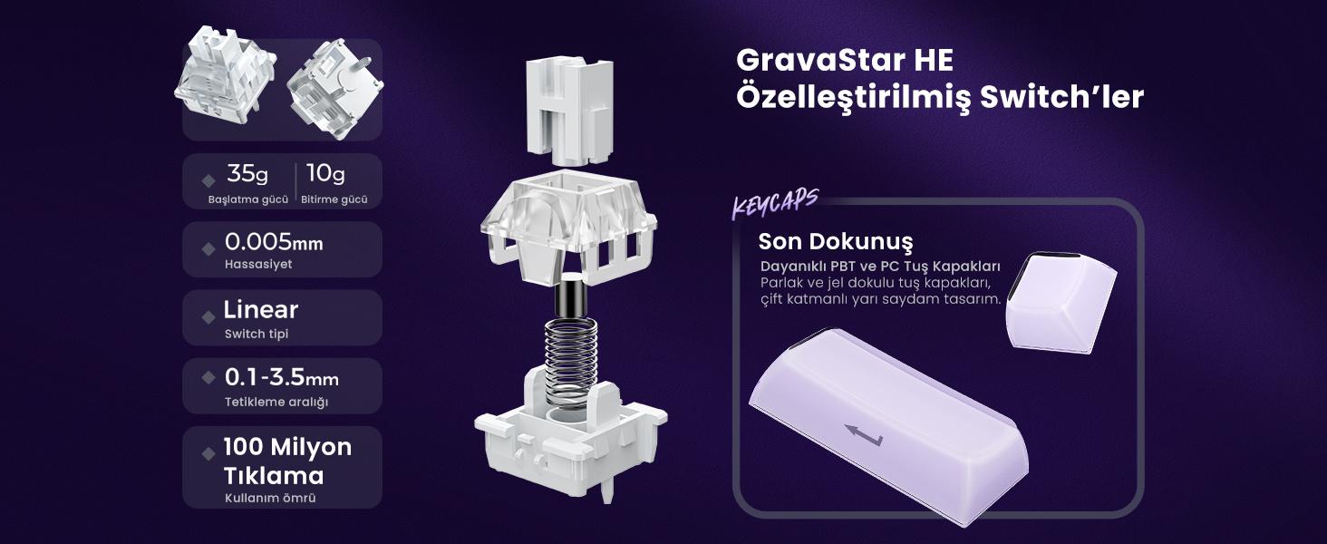 Klavyenin GravaStar x Gateron Manyetik Jade Pro Switch’leri tuş vuruşlarınızı 0,005 mm hassasiyetle algılar. Bu da oyun oynarken ya da hızlı yazı yazarken tepki süresini ve konforu maksimum seviyeye çıkarır. Bu manyetik switch, oyun dünyasının lider switch modelidir.