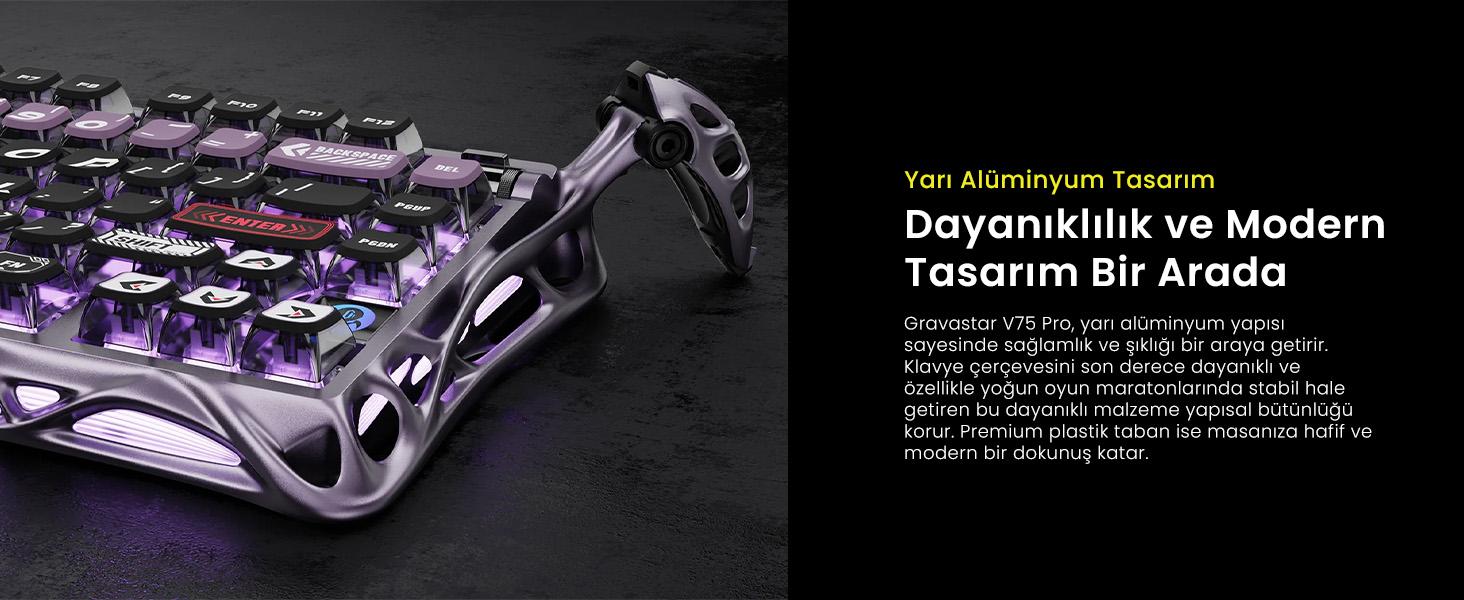 Yarı alüminyum ve karbon plaka ile desteklenen gövde, sadece klavyenin dayanıklılığı arttırmakla kalmaz aynı zamanda estetik bir dış görünüş sağlar.