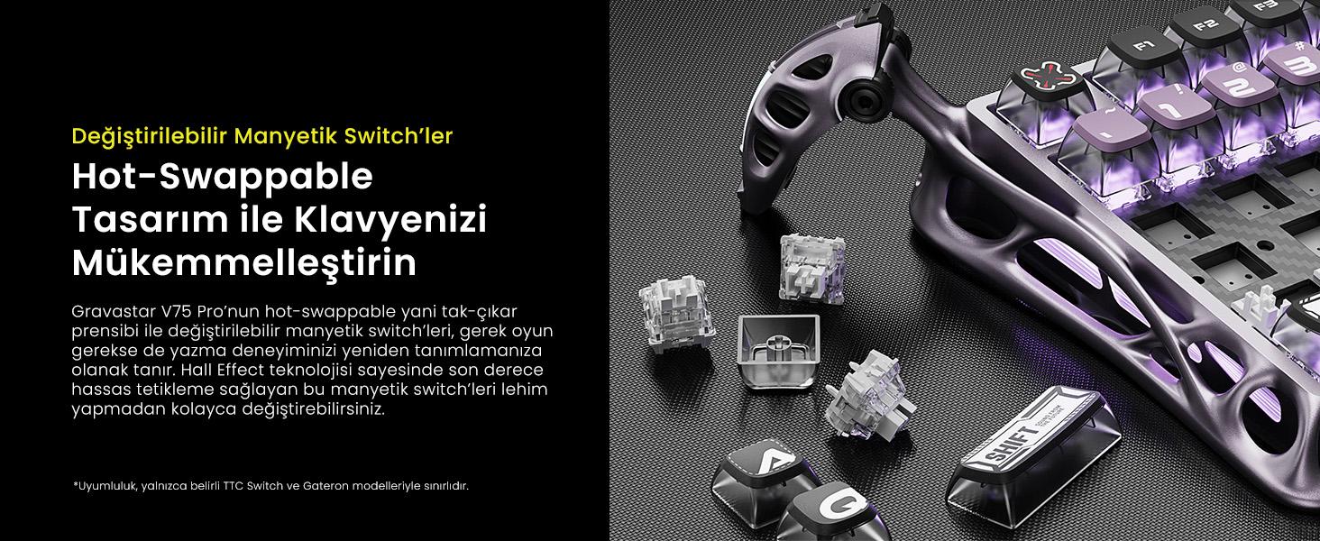 Hot-swappable switch özelliği sayesinde istediğiniz zaman switch’leri tak-çalıştır prensibi ile kolayca değiştirebilirsiniz. Switch’lerin lehim gerektirmeden değiştirilebilmesini sağlayan bu sistem ile klavyenizde oyun oynarken farklı yazı yazarken farklı switch’ler deneyebilmenizi ve özelleştirebilmenizi mümkün hale getirir.