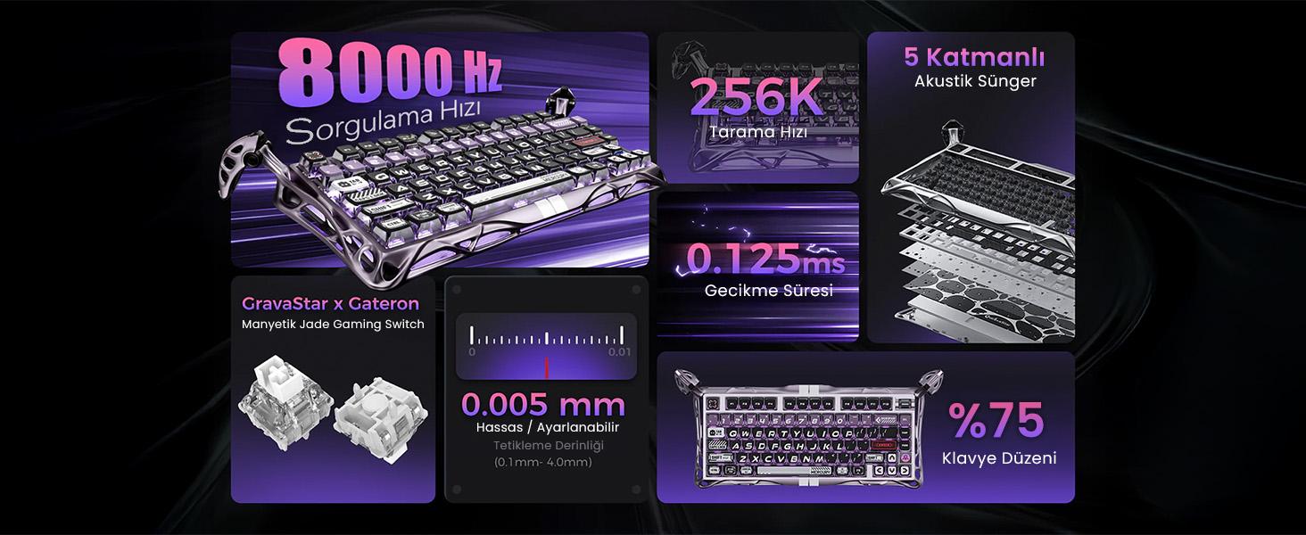GravaStar V75 Pro Manyetik Klavye, 256K tuş tarama hızına sahiptir. Bu hız, gecikmeyi anlık olarak neredeyse 0,125 ms’ye düşürerek bilgisayara iletir. 0,125 milisaniyelik bir süre, insan gözüyle fark edilmesi imkansız bir hızdır.