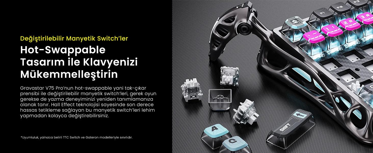 Hot-swappable switch özelliği sayesinde istediğiniz zaman switch’leri tak-çalıştır prensibi ile kolayca değiştirebilirsiniz. Switch’lerin lehim gerektirmeden değiştirilebilmesini sağlayan bu sistem ile klavyenizde oyun oynarken farklı yazı yazarken farklı switch’ler deneyebilmenizi ve özelleştirebilmenizi mümkün hale getirir.