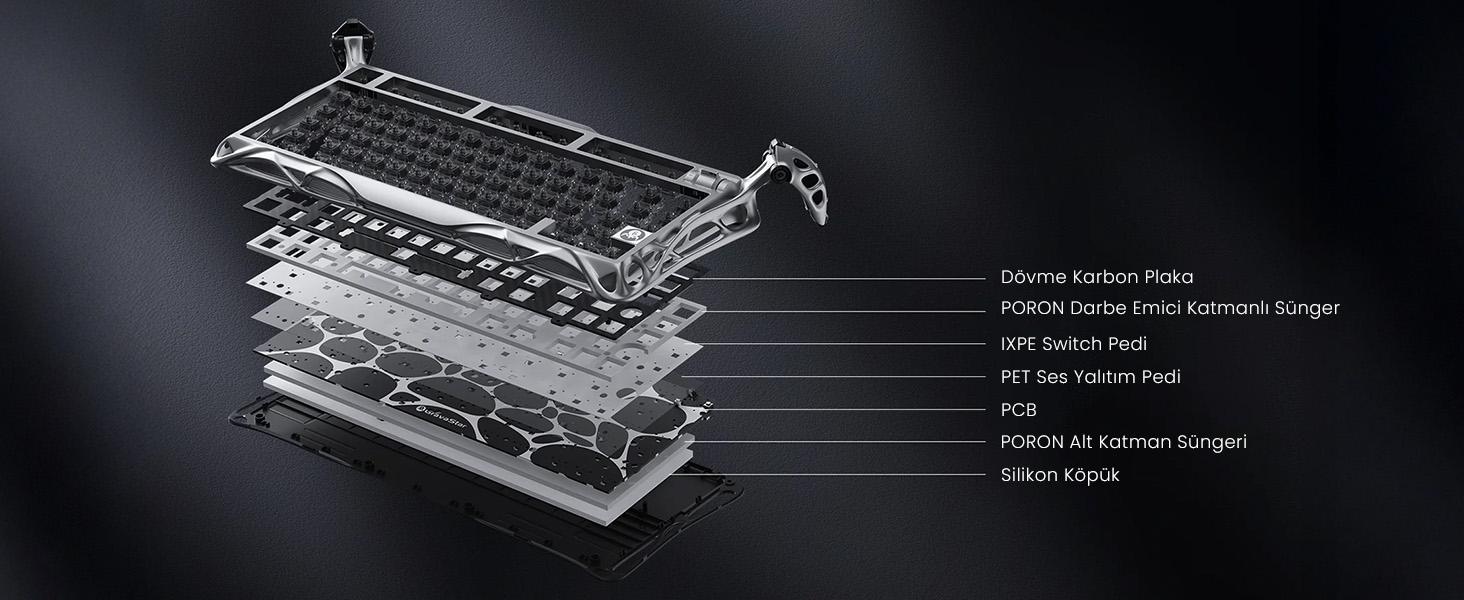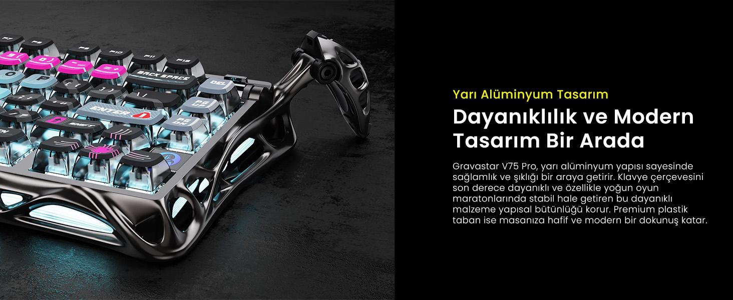 Yarı alüminyum ve karbon plaka ile desteklenen gövde, sadece klavyenin dayanıklılığı arttırmakla kalmaz aynı zamanda estetik bir dış görünüş sağlar.