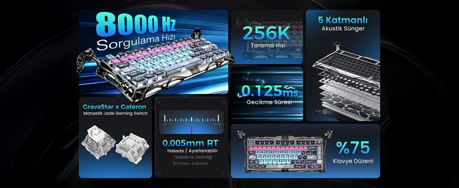 GravaStar Mercury V75 Pro Manyetik Klavye, 8.000 Hz USB sorgulama hızı ile öne çıkar. Tuş basışını saniyesel olarak bilgisayara iletme sıklığını ifade eden bu değer, V75 Pro’nun saniyede 8000 kez bilgisayara veri göndermesi anlamına gelir. Bu da klasik klavyelere göre çok daha hızlı ve kelimenin tam anlamıyla anlık tepki demektir.