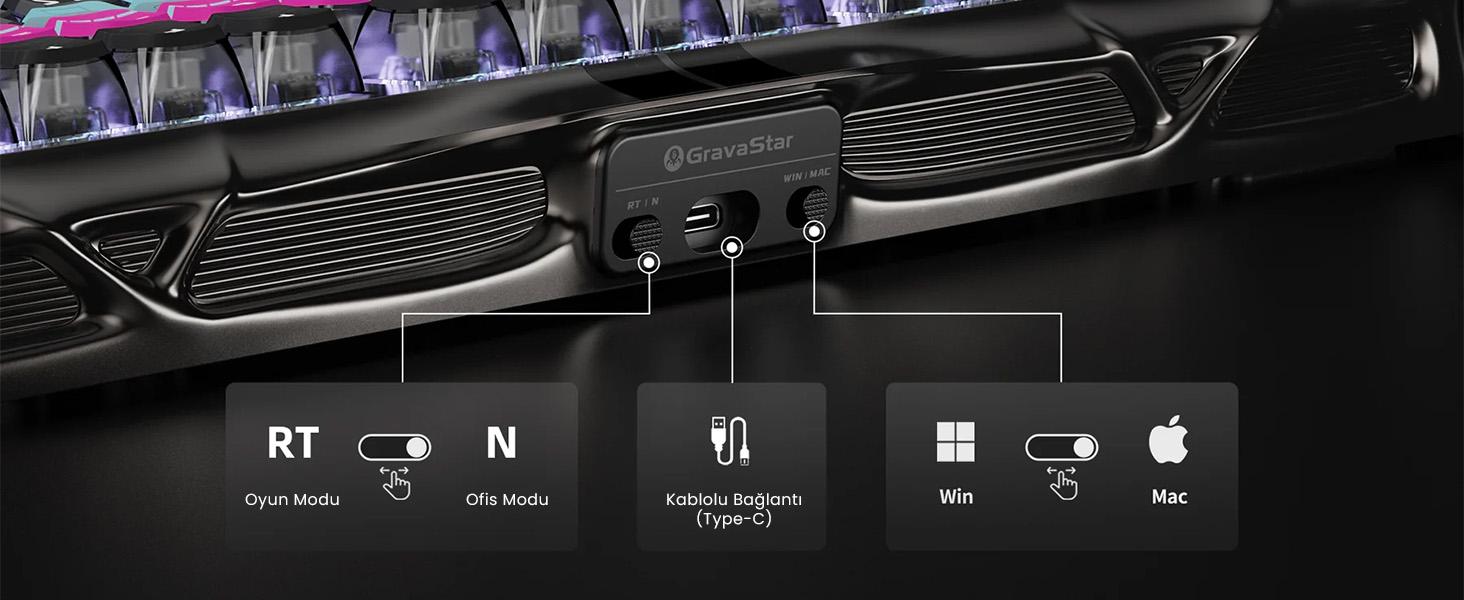 Mod değiştirme tuşunu kullanarak oyun ve ofis modu arasında kolayca geçiş yapabilir ve böylece tuş davranışlarını ya da aydınlatmayı ihtiyacınıza göre kolayca aktif hale getirebilirsiniz.