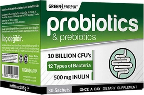 Green Farma 10 saşe Probiyotik + Prebiyotik Ürünün bir saşesinde 10 milyar probiyotik vardır.