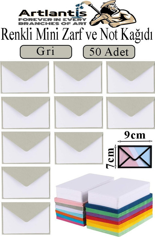 Artlantis Gri Mini Zarf 7x9 cm Not Kağıtlı 50 Adet Küçük Gri Zarf Mektup Oyun Zarfı Doğum Günü Dilekleri Zarfı Canlı Renk