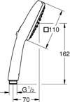 Uyarı ve Genel Açıklamalar: Yağmur, Jet. GROHE SmartSwitch - tercih ettiğiniz püskürtme seçeneğinin keyfini çıkarmak için kadranı kolayca çevirin. GROHE DreamSpray mükemmel sprey deseni. GROHE Uzun Ömürlü kaplama. SpeedClean kireç önleyici sistem. Inner WaterGuide - yüzey ve haşlanma koruması için iç yalıtım. Darbeye Dayanıklı silikon halka, duşun düşmesinden kaynaklanan hasarları önler. tüm standart duş hortumlarına uyan evrensel montaj sistemi. maksimum akış hızı (3 barda): 17,3 l/dak. düşük basınç için. dk. önerilen basınç 0,1 bar.