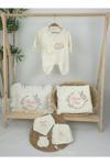 Ekru rengi ile zarif bir görünüm sunan bu set, 0-3 ay arası bebekler için uygundur.