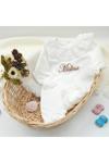 Bebeğinizin ilk anlarına özel, kişiye özgü isimli nakış desenleriyle süslenmiş dantelli 3'lü hastane çıkış seti.