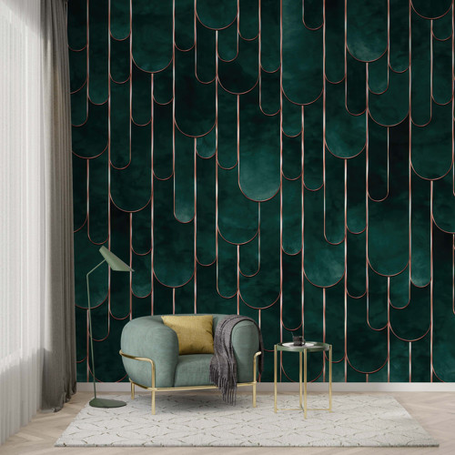 Koyu Yeşil Yarım Daireli Dalga Desenli Geometrik Duvar Kağıdı - Salon ve Oturma Odası