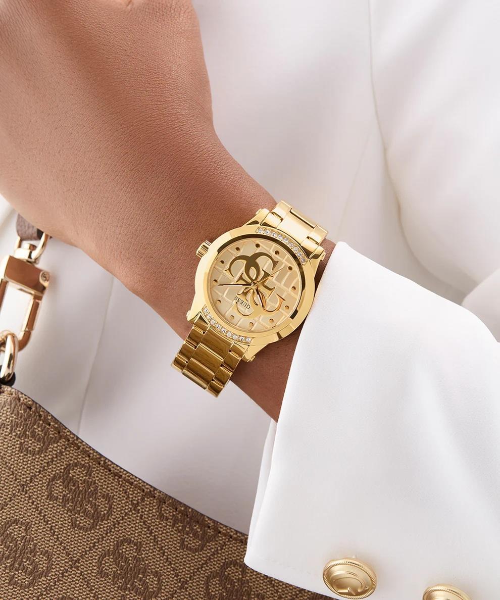 Altın tonundaki kasa ve bilezik, bilekte lüks ve zarif bir görünüm sağlıyor; hem gündelik hem de gece kıyafetleriyle kolay uyumlanıyor.