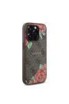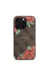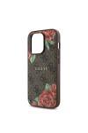 Guess İphone 14 Pro Uyumlu Guess Lisanslı Magsafe Şarj Özellikli Gül Baskılı Yazı Logolu Kapak Kahverengi