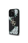Guess İphone 16 Pro Uyumlu Kılıf Lisanslı Beyaz Gül Baskılı Büyük 4G Metal Logolu Kapak Siyah