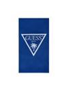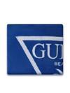 Mavi renkte palm logolu jakarlı plaj havlusu arayan kadınlar Plajda veya havuzda kullanmak için kaliteli ve şık bir havlu isteyenler Guess'in yaz temalı aksesuarlarını sevenler