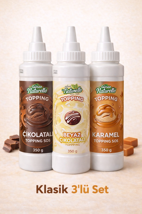 Gülşan Naturello Klasik 3’lü Topping Sos Seti, tatlı ve pastalar için en çok tercih edilen çikolata, beyaz çikolata ve karamel sosları bir arada sunar.