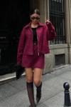 - Bordo rengiyle dikkat çeken bu süet takım, hem şıklığı hem de konforu bir arada sunar.; - İki parçadan oluşan set, ceket ve etekten oluşur; her iki parça da astarlıdır ve rahat bir kullanım sağlar.; - Kemersiz tasarımı ile sade ve modern bir görünüm kazandırırken, düz deseniyle kolayca kombinlenebilir.; - Regular kalıp sayesinde vücut hatlarınıza uyum sağlayarak rahat bir oturuş sunar.; - Uzun kollu ceket ve boru paça etek ile her mevsimde şıklığınızdan ödün vermezsiniz.; - Yırtmaç detayı ile hareket özgürlüğü sağlarken, kruvaze kapama şekliyle zarif bir dokunuş ekler.; - Gömlek yaka tasarımı, günlük kullanım için ideal olan bu takımın rahatlığını artırır.; - Dokuma kumaş tipi ve orta kalınlıkta süet dokusu, dayanıklılığı ve konforu bir arada sunar.; - Brode detaylarıyla zenginleştirilmiş bu takım, göz alıcı bir görünüm kazandırırken, baskısız yapısıyla sadeliği ön plana çıkarır.; - Yıkama talimatlarına uygun şekilde bakım yapıldığında uzun süre ilk günkü gibi kalır.