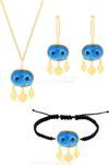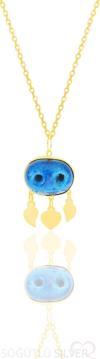 925 ayar gümüş Altın yaldızlı süryani nazar boncuğu kolye,küpe ve bileklik seti,Süryani nazar boncuğumuz tamamı el işi olup, madeni 925 ayar gümüşten yapılmaktadır.Taşı ise İran firüzedir taşın üzerindeki iki deligin anlamı iki gözü temsil eder. Bu ürün nadide ve zarif olup en çok beğenilenlerin arasındadır. Montür boyut: 12x19 mm Zincir Uzunluğu 45 cm dir.