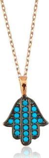 Her ne kadar Hz. Fatma'nın eli olarak bilinse de arapçada “hamse” diye anılır. Hamse, beş anlamına gelir ve bir elin parmak sayısını gösterir. Hz. Fatma bir gün mutfakta helva kavururken, eşi Hz. Ali görür ve pişen helvaya elini daldırır ancak hiçbir şey olmaz, helvayı böyle kavurmayı devam eder. O günden sonra elinin kutsallığına, gücüne adeta yenilmezliğine inanılır. Her güçlük adeta onun eliyle aşılacaktır. Bu eşsiz kolyeyi; doğum günü hediyesi, sevgililer günü hediyesi veya annelere hediye olarak özel günlerde tercih edilebilecek mükemmel bir seçenektir. Bu harika tasarım mavi Fatma eli bayan kolye; 925 ayar gümüşten imal edilmiştir. Gümüş üzerine rose altın kaplama yapılmıştır. Rose altın kaplama yapılan tüm bayan kolyeler parlaklığını uzun süre muhafaza eder, gümüşü pembe renge dönüştürür ve oksitlenmeyi geciktirir. Kolye üzerinde bulunan taşlar firuzedir. Gümüş zincir boyu ortalama 45 cm'dir. Tüm gümüş bayan kolyelerde olduğu gibi gümüş mavi Fatma eli kolye de el emeği ile üretilmiştir. Gümüş ve değerli taşlar nedeniyle belirtilen ortalama ürün ağırlığında ± %10 sapma olabilmektedir.