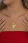 Altın kaplama detayları ve parlak taş süslemeleriyle dikkat çeken kolye, her kombine sofistike bir dokunuş katar. Hafif yapısı sayesinde gün boyu konforlu bir kullanım sunar. 925 ayar gümüşün dayanıklılığıyla uzun yıllar şıklığını koruyacak bu kolye, yalnızca bir takı değil aynı zamanda güçlü bir sembolün taşıyıcısıdır.