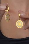 Çeyrek altın model zirkon taşlı altın kaplama çelik kadın sallantılı küpe, zarif ve göz alıcı tasarımıyla öne çıkar. Çeyrek altın görünümünü andıran yuvarlak formu, etrafındaki yaprak detaylarıyla bütünleşerek sofistike bir şıklık sunar. Zirkon taşlar, küpeye modern bir ışıltı kazandırırken altın kaplama yüzeyiyle uyumlu şekilde ışığı yansıtır. Paslanmaz çelik malzemesi sayesinde uzun ömürlü kullanım imkânı sunar. Günlük kombinlerinizi zenginleştiren bu tasarım, özel davetlerde de şıklığınızı tamamlayan iddialı bir aksesuar alternatifi olur. Kendiniz için tercih edebileceğiniz gibi, sevdiklerinize de anlamlı bir hediye seçeneği olarak sunabilirsiniz.