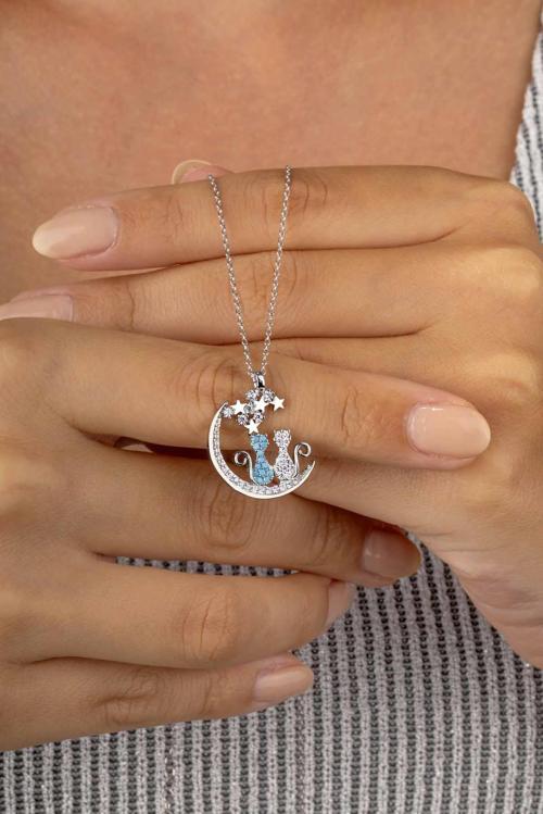 Firuze Taşlı Yıldızları İzleyen Çift Kedi 925 Ayar Gümüş Kadın Kolye, romantizmi ve şıklığı bir arada sunan özel bir tasarımdır. Ay figürü üzerinde yan yana duran iki kedi motifi, firuze ve beyaz taşlarla süslenerek zarif bir ışıltı kazanır. Yıldız detaylarıyla tamamlanan kolye, sevgi ve birlikteliğin en güzel sembollerinden biri olarak öne çıkar.