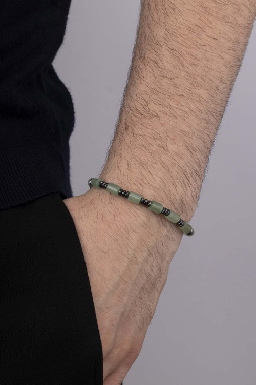 Hematit taşı geçişli ceyt doğal taş erkek bileklik, şıklığı ve enerjisiyle öne çıkan modern bir aksesuardır. Silindir kesim ceyt taşlarının doğal yeşil tonları, hematit taşlarının parlak ve güçlü geçişleriyle birleşerek zarif bir kontrast oluşturur. Elastik yapısı sayesinde bileğe rahatça oturur ve günlük kullanıma uygundur.