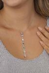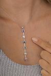 Kolye üzerinde yer alan mor, mavi, yeşil, pembe ve beyaz tonlarındaki taşlar, ışığın geliş açısına göre parlayarak etkileyici bir ışıltı oluşturur. Minimalist ama aynı zamanda göz alıcı bir yapıya sahip olan bu tasarım, hem günlük kullanım hem de özel davetler için şık bir tamamlayıcıdır.