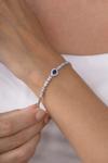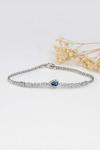 925 ayar gümüşten üretilen bu zarif bileklik, merkezdeki safir tonlarındaki damla taş ve etrafını çevreleyen parlak zirkonlarla sofistike bir görünüm kazandırıyor. Su yolu tasarımı, bileğe zarif bir şekilde otururken özel günlerinizde şıklığınızı tamamlayan bir aksesuar olur.