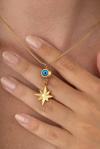 Paslanmaz çelik üzerine altın kaplama sayesinde uzun ömürlü kullanım sunan bu kolye, zamansız tasarımıyla her kombine uyum sağlar. Nazar boncuğu negatif enerjilere karşı koruyucu bir sembol iken, kutup yıldızı doğru yolu ve rehberliği temsil eder.