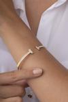 Modern şıklığı zarafetle buluşturan altın kaplama çelik kelepçe bileklik, göz alıcı taş detaylarıyla bileğinizde ışıltılı bir dokunuş yaratıyor. Üzerinde yer alan yuvarlak taşlar, tasarıma hem klasik hem de zamansız bir hava katarken günlük kombinlerinizden özel davetlerinize kadar her anınıza eşlik edecek bir aksesuar sunuyor.