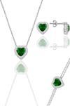 925 ayar gümüş rodyumlu kök zümrüt taşlı kalp modeli kolye,bileklik ve küpe üçlü set…Kolye Montür Boyut:9 mm Bileklik ve Küpe 8,2 mm Bileklik Uzunluk:16+3 cm Zincir Uzunluk:45 cm