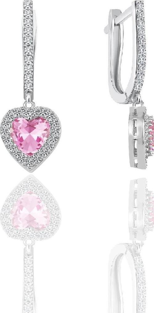 925 ayar gümüş rodyumlu pırlanta montürlü pembe zirkon taşlı sallantılı kalp küpe. Yukarıdan Aşağıya:25 mm Kalp Boyut:8,3 mm