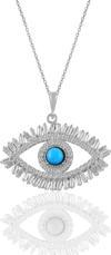 925 ayar gümüş rodyumlu turkuaz ve baget kesim zirkon taşlı göz kolye... Montür Boyut : 19x25 mm Zincir Boyutu:45 cm
