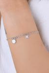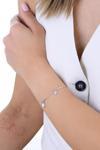 925 ayar Gümüş rodyumlu zirkon ve sedef taşlı top detaylı sallantılı yonca bileklik. Yonca Boyut:7.3 mm Uzunluk:16+3 cm uzatmalı