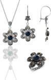 925 ayar gümüş safir taşlı papatya modeli telkari işlemeli kolye küpe ve yüzük üçlü set.Zincir uzunluk:45 cm Küpe Yukarıdan Aşağı:44 mm Papatya Boyut:20 mm yüzük alttan ayarlamalıdır.