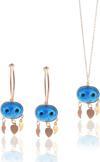 925 ayar gümüş rose rengi süryani nazar boncuğu halkalı küpe ve kolye.Boyut:küpe halka çapı 2 cm nazar boncuğu:(sallamaları ile beraber):19x24 mm kolye :(sallamaları ile beraber):19x24 mm zincir uzunluğu 45 cm