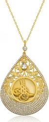 Tuğra, Osmanlı sultanlarının imzası anlamına gelir. Her tuğra; ona ait olan padişahın ismini, varlığını, hükümdarlığını ifade eder. Tuğra sembolü her padişaha göre farklı olmak üzere birçok şekilde günümüze ulaşmıştır. Tuğra Osmanlının her döneminde korunmuş, önemini hiç kaybetmemiştir. Ve zamanla hat sanatımızda da önemli bir yere sahip olup, günümüzde hattatlar tarafından sanatsal olarak yaşatılmaktadır. Bu mükemmel kolyeyi; doğum günü hediyesi, sevgililer günü hediyesi veya annelere hediye olarak özel günlerde tercih edebilirsiniz. Tuğra bayan kolye 925 ayar gümüşten imal edilmiştir. Gümüş üzerine altın kaplama yapılmıştır. Altın kaplama yapılan kolye modelleri parlaklığını uzun süre muhafaza eder, gümüş rengini sarı renge dönüştürür ve oksitlenmeyi geciktirir. Üzerinde bulunan beyaz taşlar zirkondur. Zincir uzunluğu 50 - 55 cm'dir. Tüm gümüş bayan kolyelerde olduğu gibi gümüş tuğra bayan kolye modeli de el emeği ile üretilmiştir. Gümüş ve değerli taşlar nedeniyle belirtilen ortalama ürün ağırlığında ± %10 sapma olabilmektedir.