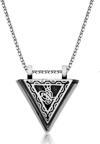Tuğra, Osmanlı sultanlarının imzası anlamına gelir. Her tuğra; ona ait olan padişahın ismini, varlığını, hükümdarlığını ifade eder. Tuğra sembolü her padişaha göre farklı olmak üzere birçok şekilde günümüze ulaşmıştır. Tuğra Osmanlının her döneminde korunmuş, önemini hiç kaybetmemiştir. Ve zamanla hat sanatımızda da önemli bir yere sahip olup, günümüzde hattatlar tarafından sanatsal olarak yaşatılmaktadır. Bu maneviyatla oluşturulan erkek kolye; 925 ayar gümüşten imal edilmiştir. Kolye üzerine oksit kaplama yapılmıştır.Diğer gümüş kolyelerde olduğu gibi gümüş tuğralı muska erkek kolye de tamamı el emeği ile üretilmiştir. Gümüş ve değerli taşlar nedeniyle belirtilen ortalama ürün ağırlığında ± %10 sapma olabilmektedir.
