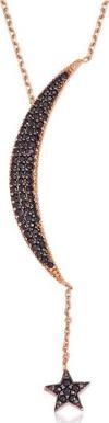 Türk bayrağının ilhamını da kan gölüne yansıyan ay ve yıldızdan aldığını biliyoruz. Bayrağın taşıdığı kutsal anlamı boynunuzda taşımak ve sevdiklerinizle paylaşmak için kaçırılmayacak bir fırsat sunuyoruz. 925 ayar gümüşten imal edilmiş olan bu ay yıldız bayan kolye üzerindeki siyah taşlar zirkondur. Gümüş üzerine rose altın kaplama yapılmıştır. Rose altın kaplama yapılan tüm gümüş bayan kolye modelleri parlaklığını uzun süre muhafaza eder, gümüşe pembe rengini verir, oksitlenmeyi geciktirir. Kolyenin 45 cm uzunluğunda gümüş zinciri vardır. Tüm gümüş bayan kolye modellerimizde olduğu gibi gümüş zincirli ay yıldız bayan kolye modeli de el emeği ile üretilmiştir. Gümüş ve değerli taşlar nedeniyle belirtilen ortalama ürün ağırlığında ± %10 sapma olabilmektedir.