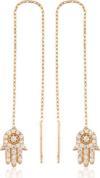 Her ne kadar Hz. Fatma'nın eli olarak bilinse de arapçada “hamse” diye anılır. Hamse, beş anlamına gelir ve bir elin parmak sayısını gösterir. Hz. Fatma bir gün mutfakta helva kavururken, eşi Hz. Ali görür ve pişen helvaya elini daldırır ancak hiçbir şey olmaz, helvayı böyle kavurmayı devam eder. O günden sonra elinin kutsallığına, gücüne adeta yenilmezliğine inanılır. Her güçlük adeta onun eliyle aşılacaktır. Bu eşsiz küpe; doğum günü hediyesi, sevgililer günü hediyesi veya annelere hediye olarak özel günlerde tercih edilebilecek mükemmel bir seçenektir. Bu harika tasarım Fatma eli bayan bayan küpe; 925 ayar gümüşten imal edilmiştir. Gümüş üzerine rose kaplama yapılmıştır. Rose altın kaplama yapılan tüm gümüş küpe modelleri parlaklığını uzun süre muhafaza eder, gümüşü pembe rengine çevirir, oksitlenmeyi geciktirir Küpe üzerinde bulunan beyaz taşlar zirkondur. Tüm gümüş bayan küpelerde olduğu gibi zincirli Fatma eli bayan küpe de el emeği ile üretilmiştir. Gümüş ve değerli taşlar nedeniyle belirtilen ürün ağırlığında ± %10 sapma olabilmektedir.