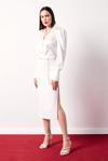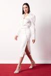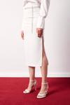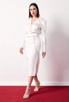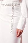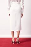 Yüksek bel, arka fermuarlı, yan derin yırtmaçlı, diz altı boy, gümüş zincirli kalem etek.