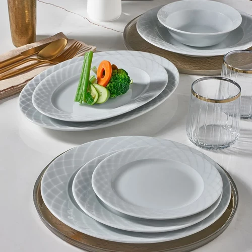 Kahvaltıdan akşam yemeğine kadar tüm sunumlarınızda kullanabileceğiniz, kendinden rölyefli, şık ve modern sofralar için Alfa 24 Parça 6 Kişilik Yemek Takımı...