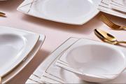 Güral Porselen’in özgün tasarımı Caroline serisi, altın dokunuşlu çizgileriyle sofranıza zarafet getiriyor. Kare formu, modern estetik anlayışını yansıtırken, sade beyaz zemin üzerindeki altın hatlar her öğünü özel kılıyor.