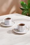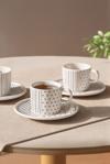 Her bir fincan ve tabağı, porselenin dayanıklılığıyla birlikte estetik bir görünüm sunuyor. Çizgiler ve noktalardan oluşan dengeli desenler, zarif bir dinamizm katarken kullanım kolaylığını da ön planda tutuyor.