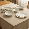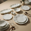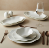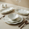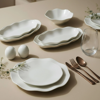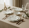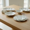 Nesrin serisi, kenarlardaki hafif dalga formu ve gümüş file detayın sade ışıltısıyla modern sofraların en zarif halini sunuyor. Porselen yüzeyin pürüzsüz dokusu, hem günlük kullanımda hem davet sofralarında minimal bir lüks hissi yaratıyor.