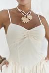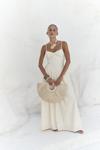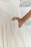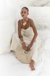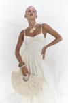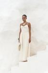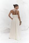 İnce askılı, ön büzgü yaka detay uzun elbise. Bel kısmı oturan formda, etek kısmı geniş kesim ve dökümlüdür. Astarlı.