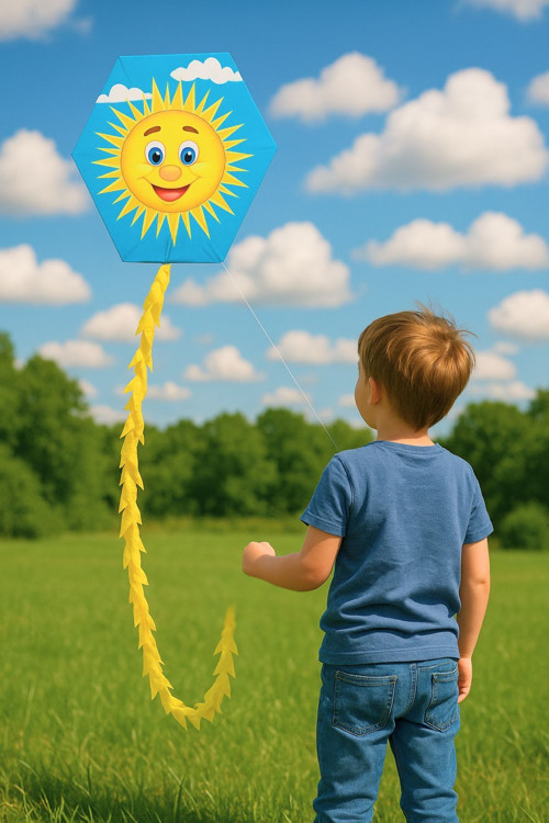 Renkli tasarımı ve sevimli güneş figürüyle dikkat çeken bu altıgen uçurtma, çocukların hayal gücünü harekete geçirirken aynı zamanda onları doğa ile buluşturarak sağlıklı eğlence sunar.