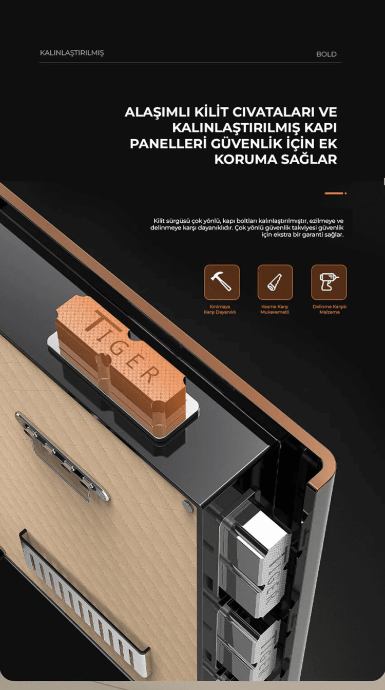 Alaşımlı kilit boltları ve kalınlaştırılmış kapı panelleri sayesinde, kırma, kesme ve delmeye karşı maksimum koruma sağlar.