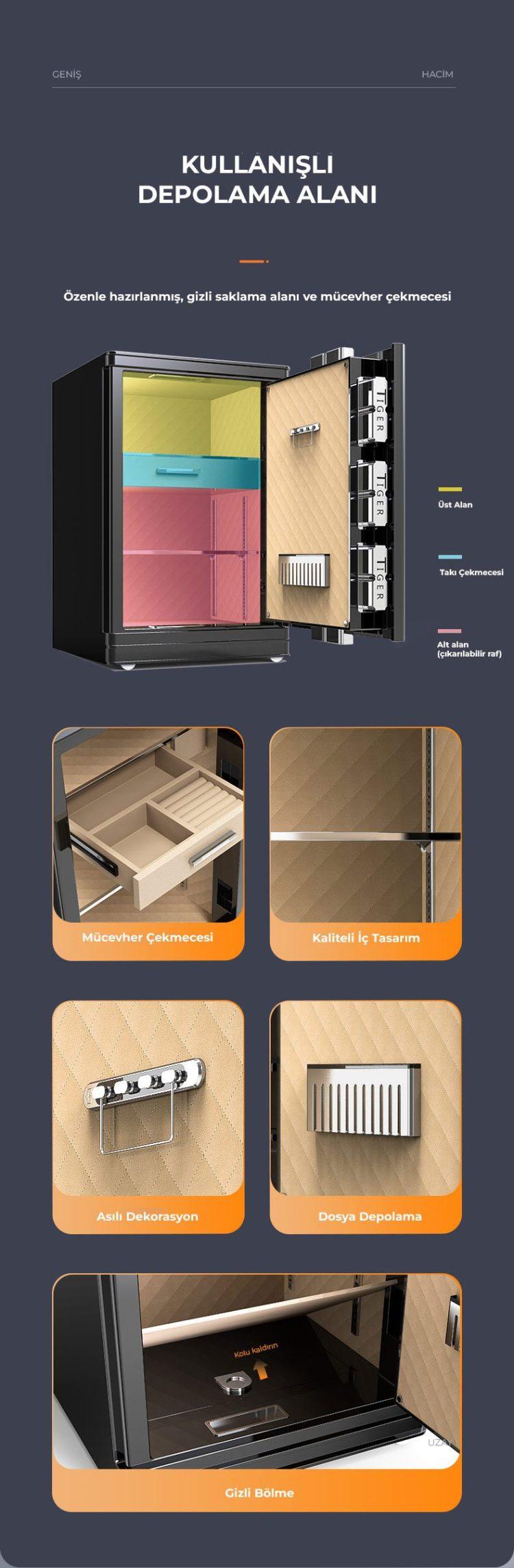 Kasa içerisinde kasanın en alt kısmında kilitli ve gizli bölme bulunmaktadır.