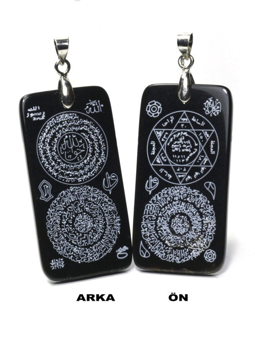 Ilgın Doğal Taş Takı Hakiki Siyah Akik Üzerine Mührü Süleyman ve Zırh Duaları İşlemeli Çift Taraflı Koruyucu Kolye
